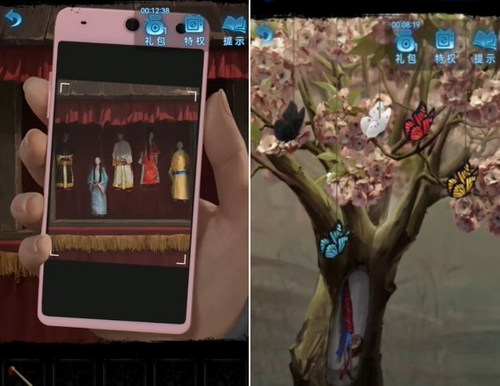 10、把布球放到娃娃旁边,去木偶戏台,通过小钟的手机看到一些线索,根据颜色和高低位置调整树上对应的蝴蝶位置,获得道具拨浪鼓和靠旗。(注意:树上蝴蝶除了可以调上下,还可以根据颜色调换位置)
